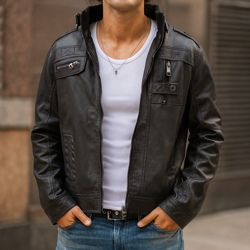 This moto-style jacket is crafted from durable faux leather with a slightly distressed finish. It features a stand collar with ribbed lining, multiple zippered and flap pockets, and detailed stitching for a structured look. A full front zip closure and adjustable shoulder epaulettes add utility and edge, making it suitable for everyday wear.